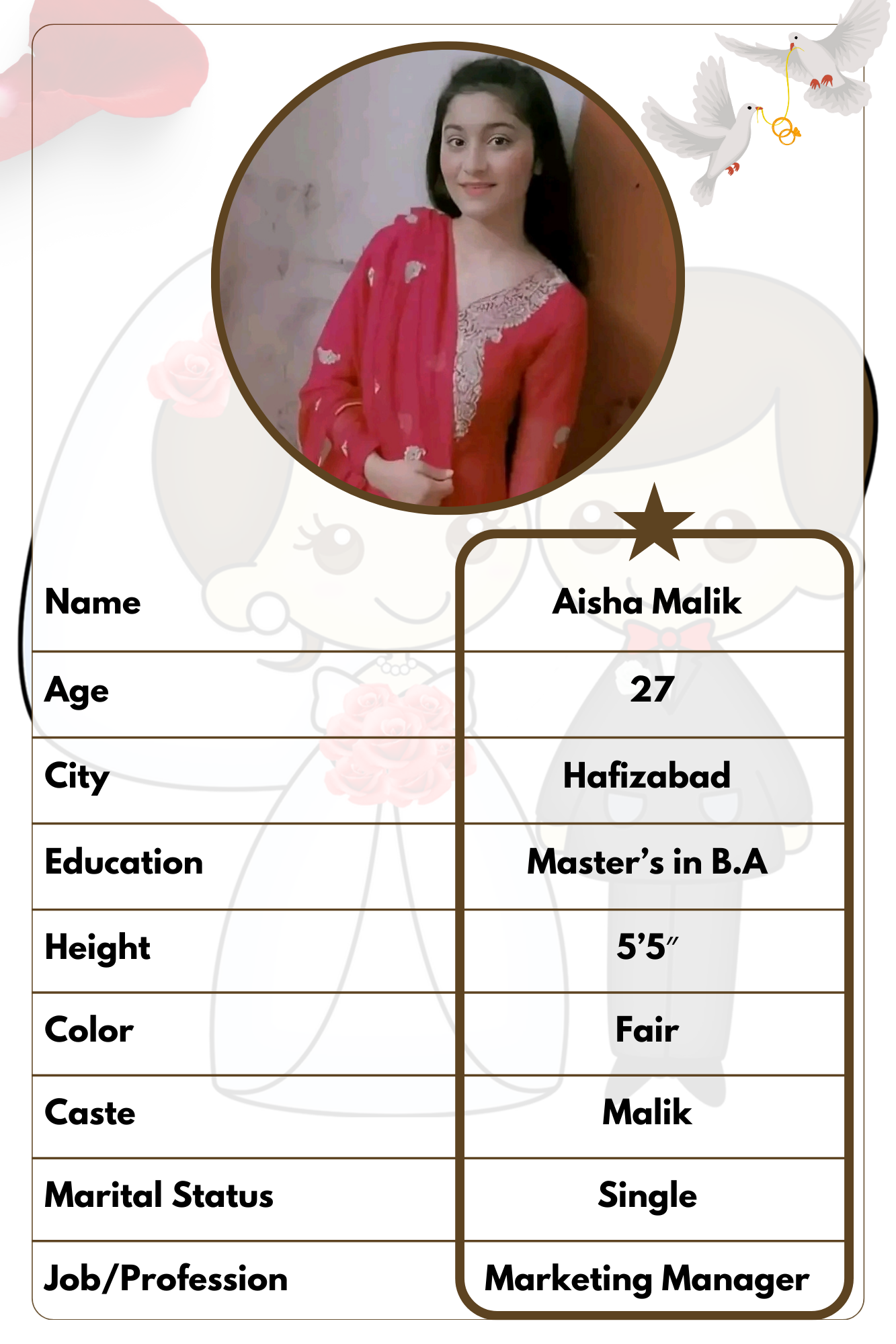 Aiman is 28, a bank officer in Quetta. She is balanced, respectful, and wants a stable family life.