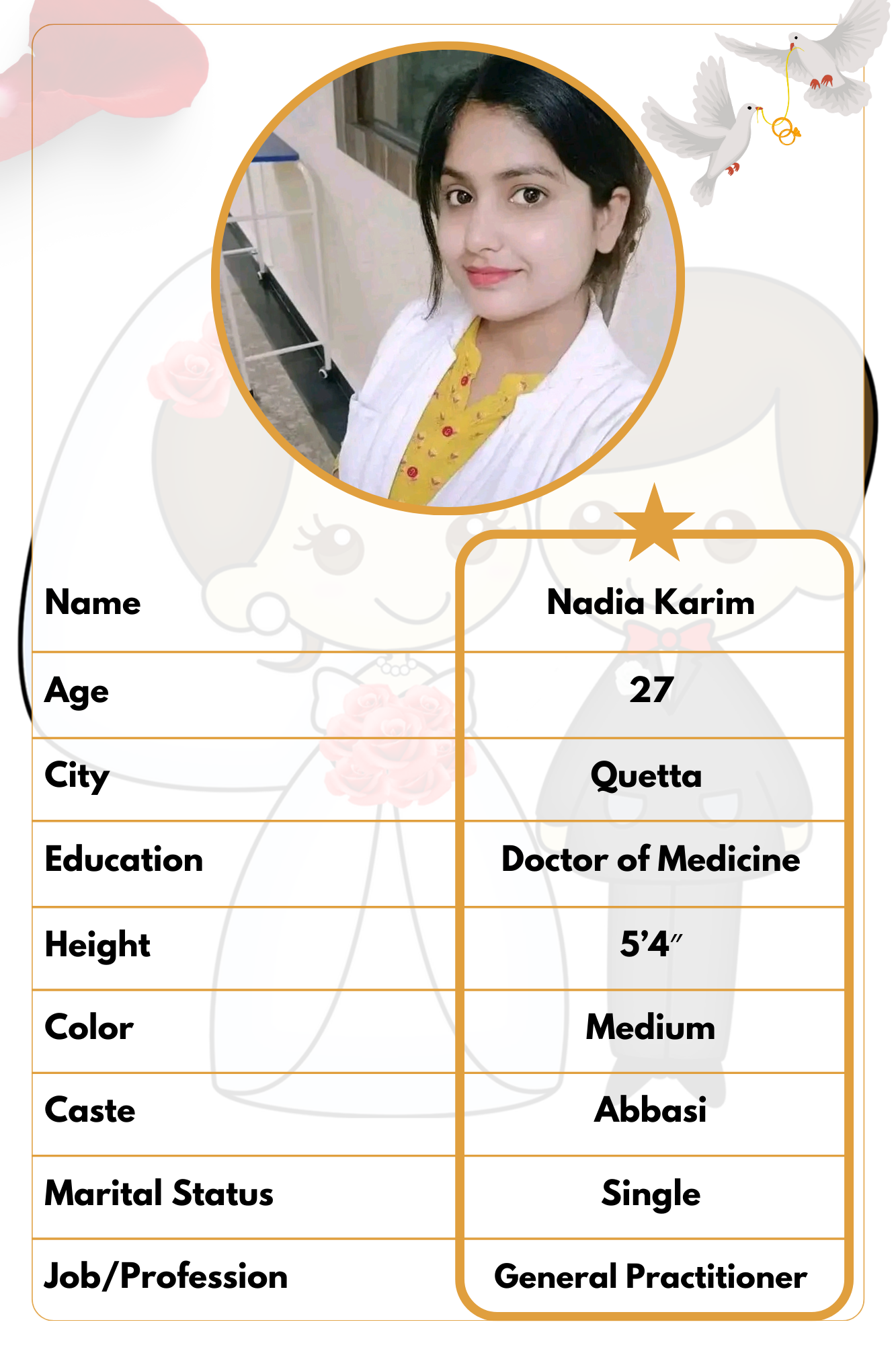 Hoorain is 29, working as a nurse in Quetta. She is caring, practical, and values respect in marriage.